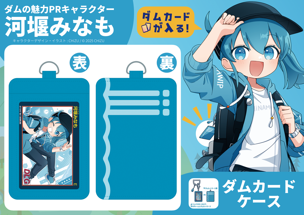ダムカードケースは、おでかけVer.のみなもちゃんがリュックに下げているダムカードケースをグッズにしたものです。ダムカードが入るサイズで、お好みのダムカードを入れて持ち歩くことができるアイテムとなっています。ケースと一緒に下げているしずくのチャームのセットもあります。