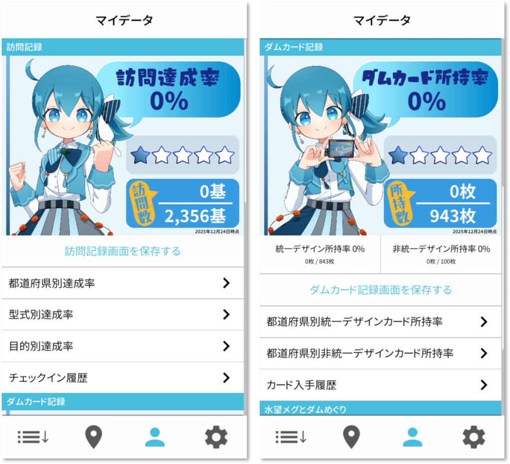ダムを何基訪問したか、ダムカードを何枚集めたかの記録画面にみなもちゃんが登場します。訪問数、ダムカードの枚数に応じて、それぞれ3枚、あわせて6枚のイラストが切り替わります。ぜひすべての段階のイラストを見ることを目指して、ダムめぐり、ダムカード集めをしてみてください!
