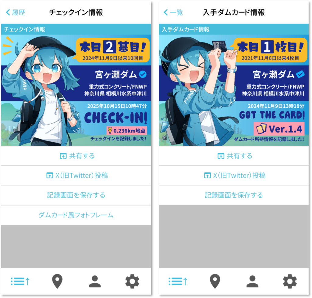・チェックイン・ダムカード記録画面