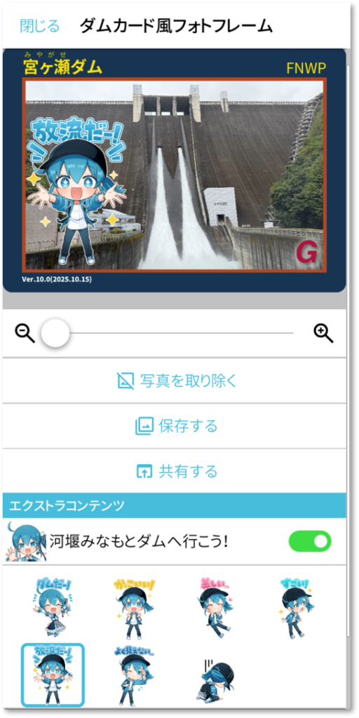 ダムへチェックイン(訪問記録を作成)すると、自身で撮った写真をダムカード風フォトフレームで飾ることができる機能があり、そこにみなもちゃんスタンプを使用することができます。
